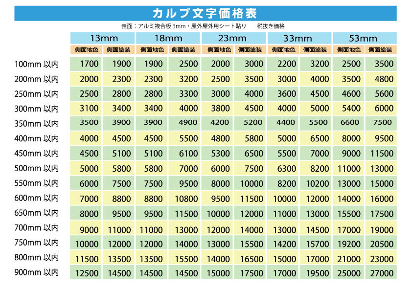価格設定の目安です。正確な見積もりはデザイン設定で検討して出しますのでご相談ください